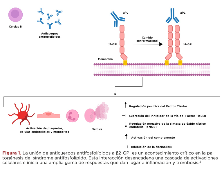 Los anticuerpos antifosfolípidos aPL son producidos por los linfocitos B. Inicialmente, se creía que los aPL eran capaces de unirse a fosfolípidos aniónicos como la cardiolipina y la fosfatidilserina; sin embargo, más tarde se descubrió que los aPL se dirigen contra proteínas particulares de unión a fosfolípidos como la β2 glucoproteína I (β2-GPI), la protrombina, la anexina, etc. Estos anticuerpos interactúan con estas proteínas de forma que pueden activar las células endoteliales, aumentar la regulación de los factores procoagulantes y estimular los procesos inflamatorios, contribuyendo significativamente a la patogénesis de la trombosis observada en el síndrome antifosfolípido.4